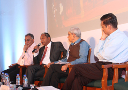 Dr. V. Aravind on the dias with other dignitaries - Seminar at Pragathi Maidan New Delhi 17-07-2016. Mr Asheesh Sharma IAS- JS-DGT is at Dr.V.Aravind`s left. Dr V Aravind`s Answering questions from the audience - 17-07-2016